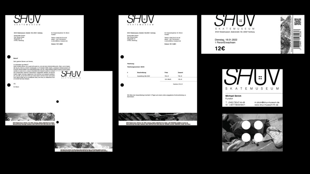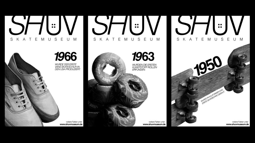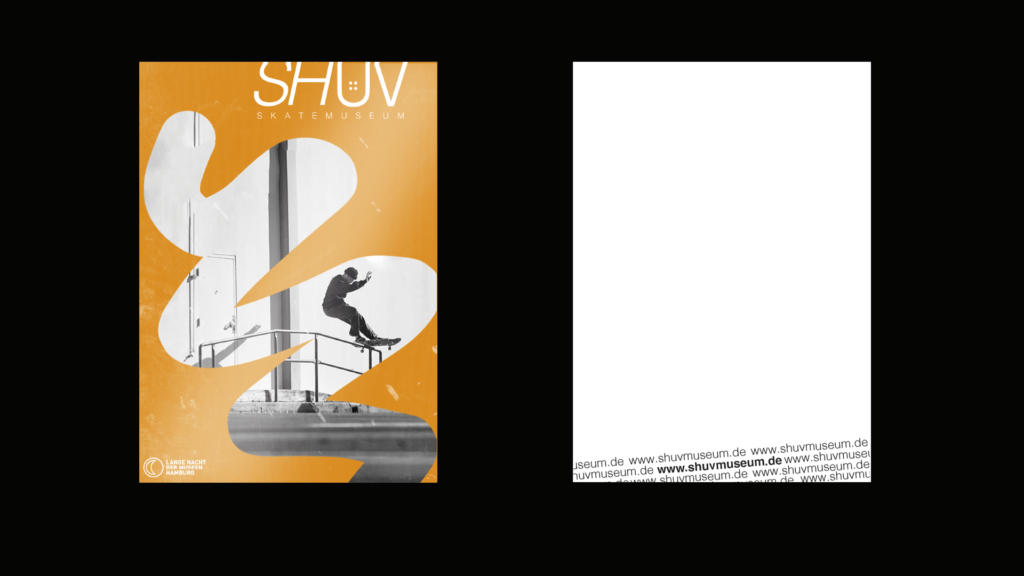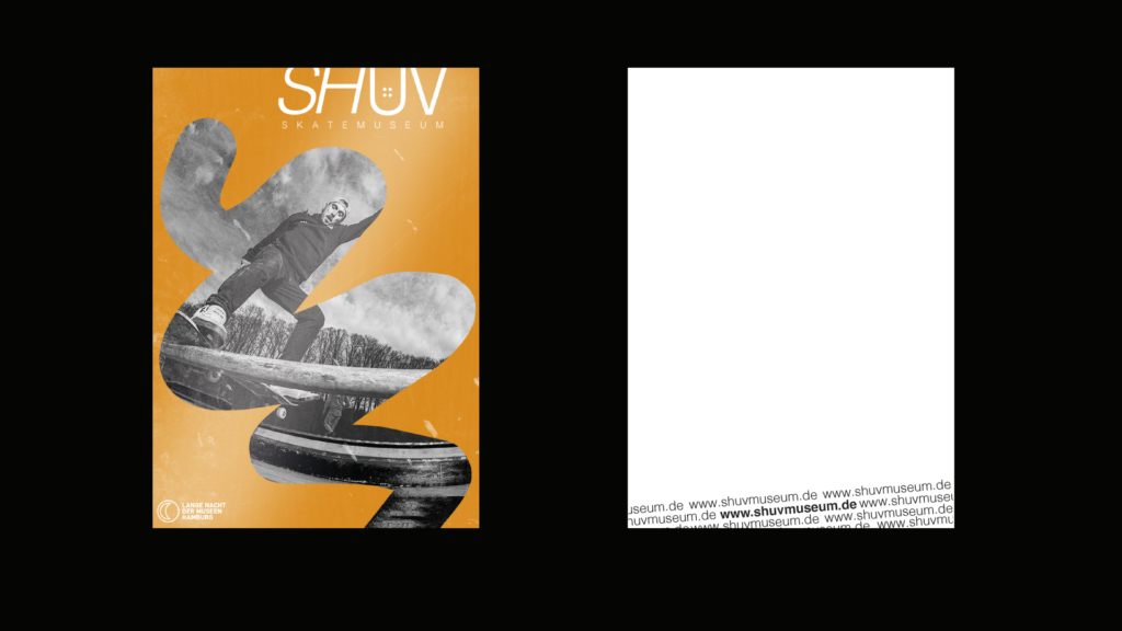 SHUV ist ein Konzept für ein Skateboardingmuseum in Hamburg. In einem schlichten Stil soll es die Ästhetik und Dynamik des Sportes sowie das Stilbewusstsein der Skateboardinszene repräsentieren. Hierzu habe ich ein umfassendes Corporate Design sowie eine weiterführende Werbekampagne anlässlich der Langen Nacht der Museen entworfen. Ausschließlich für Unizwecke erstellt.